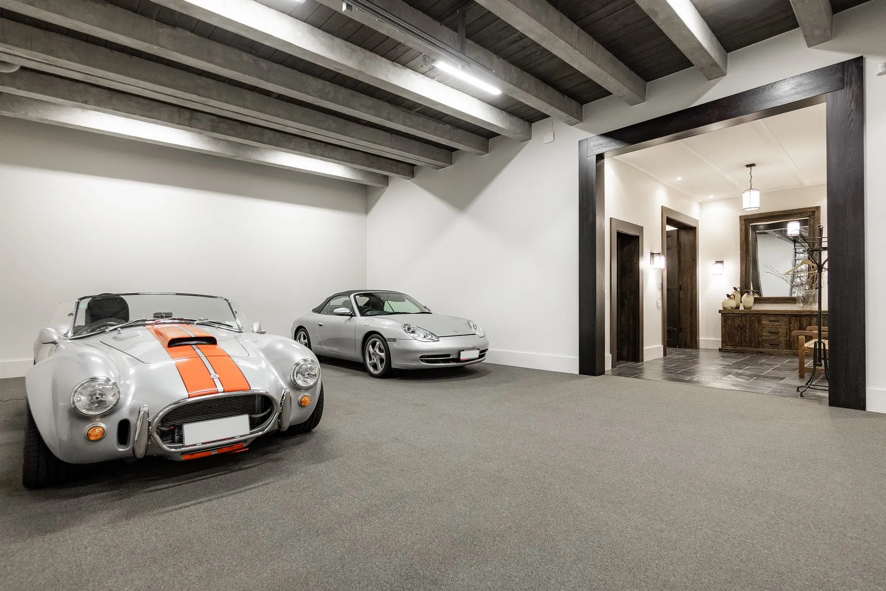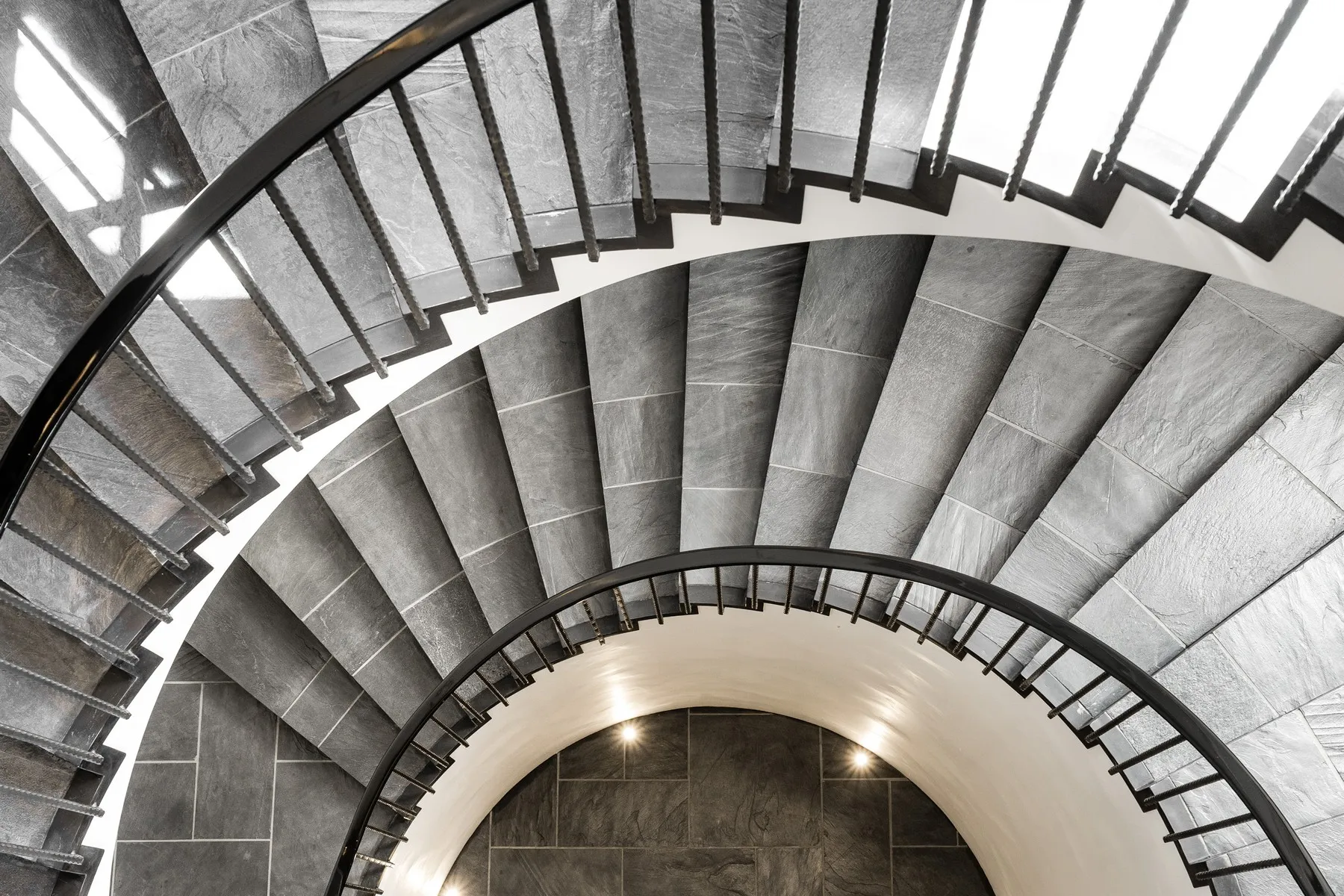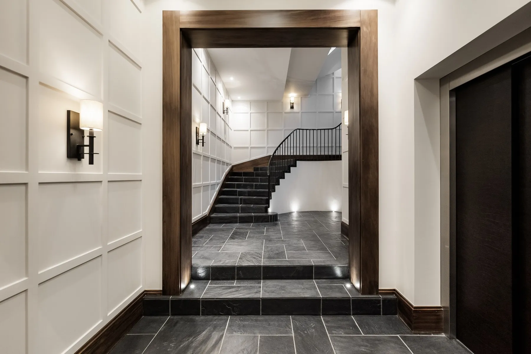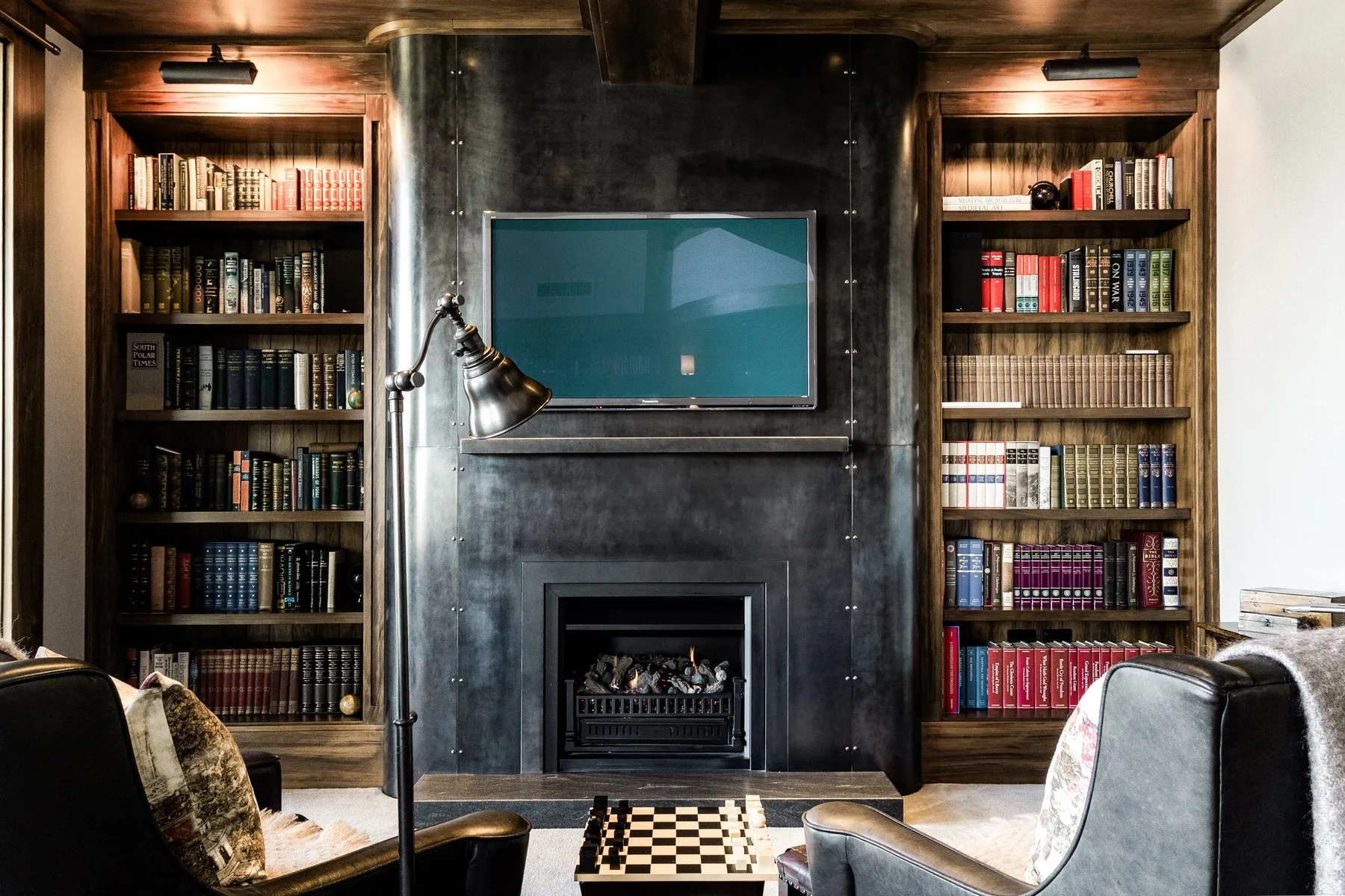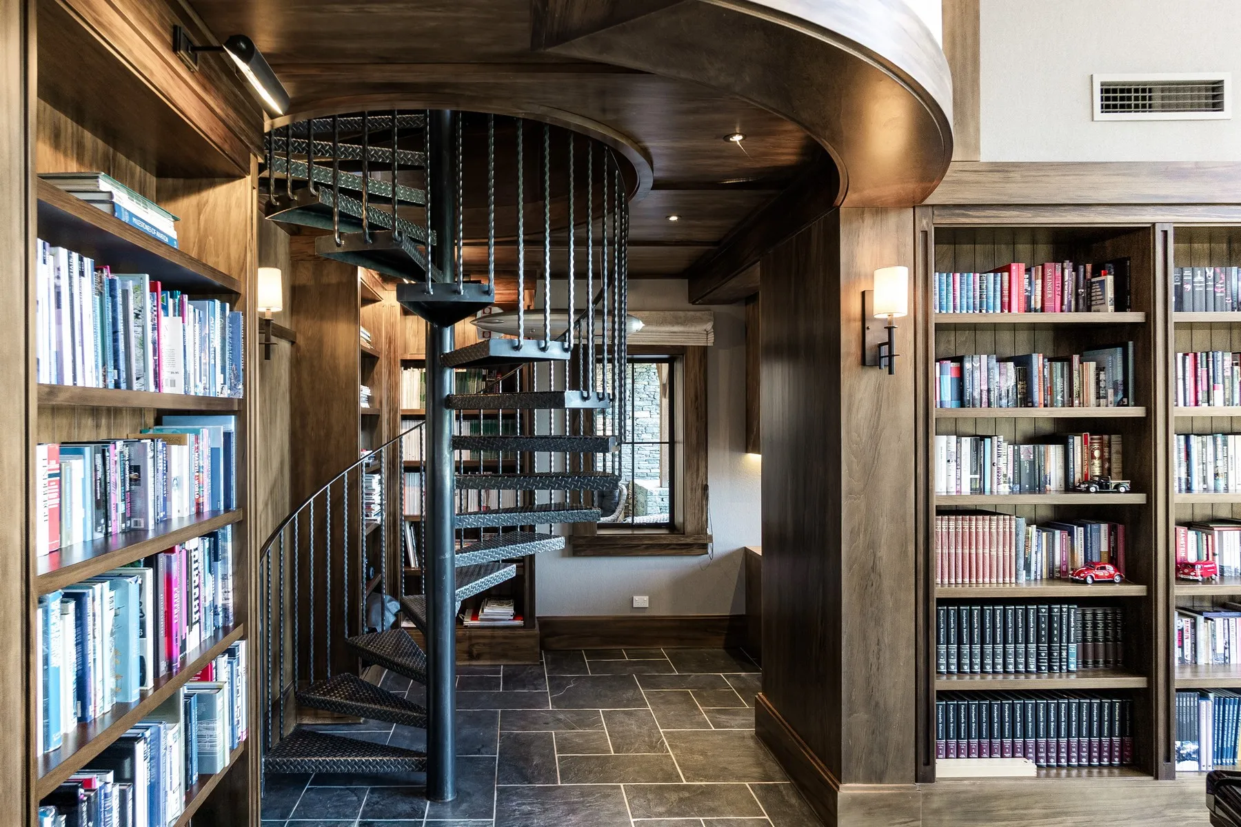A five-car garage sits at the top of the winding driveway, where the home’s facade stands accented by reclaimed kauri timber and schist stone. Bold design details like raised wall paneling and slate flooring lead into the home from the foyer. Opposite the sculptural spiral staircase, residents can venture into the library with a vaulted ceiling and its own staircase that leads to a landing for a special bird’s-eye view.