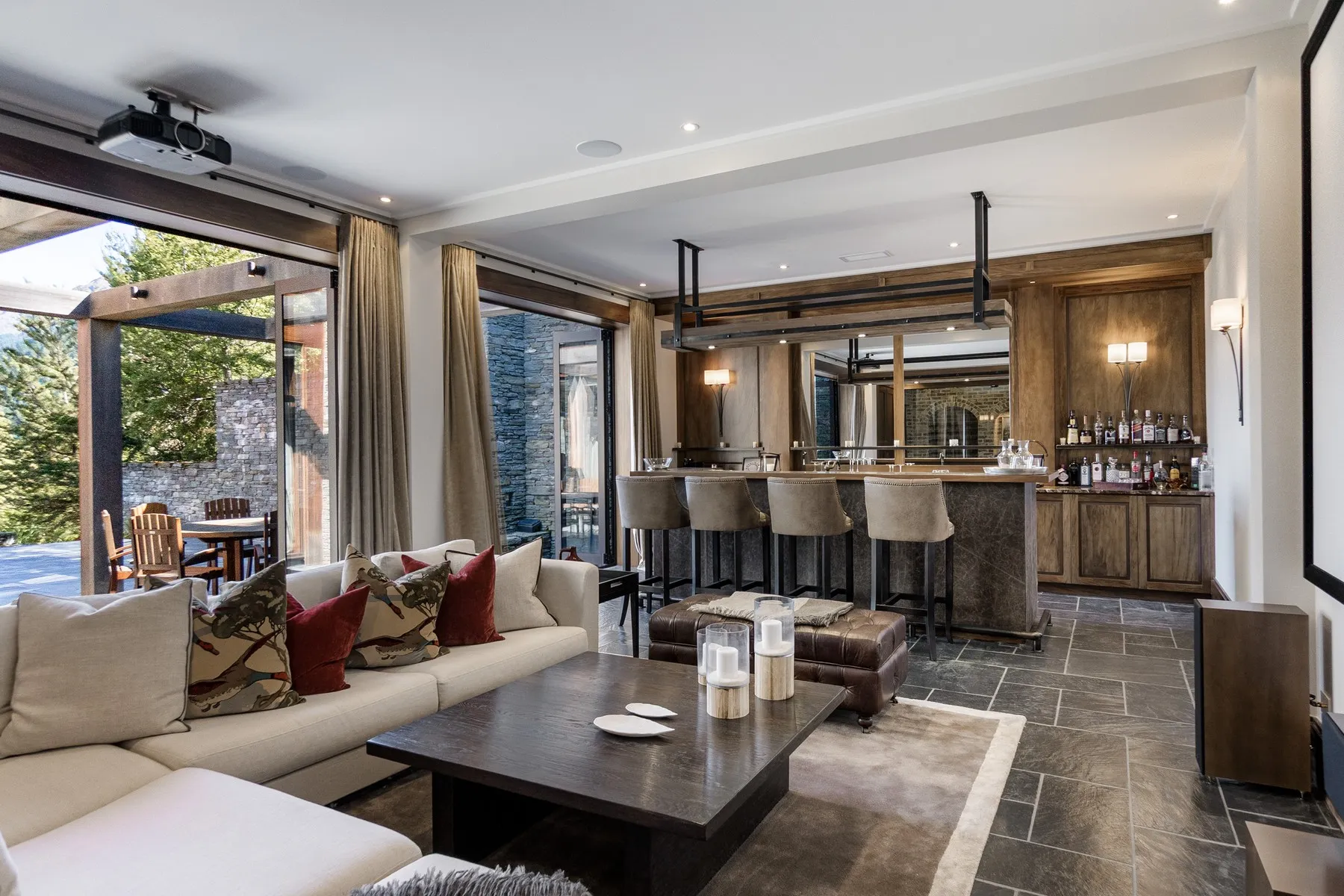 A primary bedroom wing grants owners access to two suites, each with a private bathroom and walk-in closet and towering cathedral ceilings that allow an abundance of sunlight to stream in. A secluded guest wing provides access to another en-suite bedroom with a walk-in closet, plus an adjoining private lounge. Additional amenities located around the residence include a bar set next to a screening area, as well as a home theater and curated wine cellar.