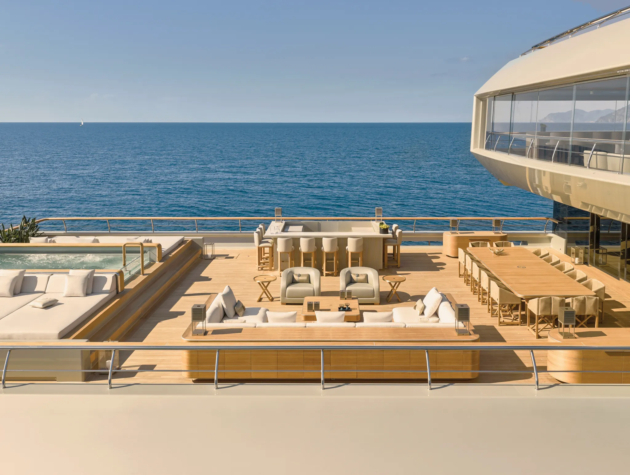 Meanwhile, the six private quarters offer a masterclass in customisation. The fullbeam VIP cabin rivals the main suites of many same-size yachts and is large enough to create two staterooms via a partition door, both with velvet onyx ensuites. The owner’s deck is the designer’s pièce de résistance, featuring a 139 m² suite with a private lounge that turns into a cinema. Sliding-glass doors lead to the 14-seat dining table, bar and glass-bottomed pool, and a sunken seating area on the foredeck includes a bioethanol firepit at the bow. Armani also paid special attention to the well-being of the yacht’s 19-member crew, creating discreet stairways, generous sleeping spaces and their own dedicated deck forward of the wheelhouse for socialising.