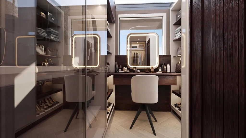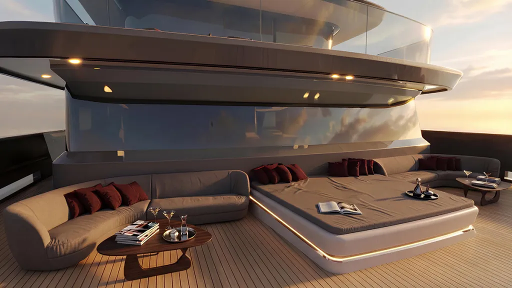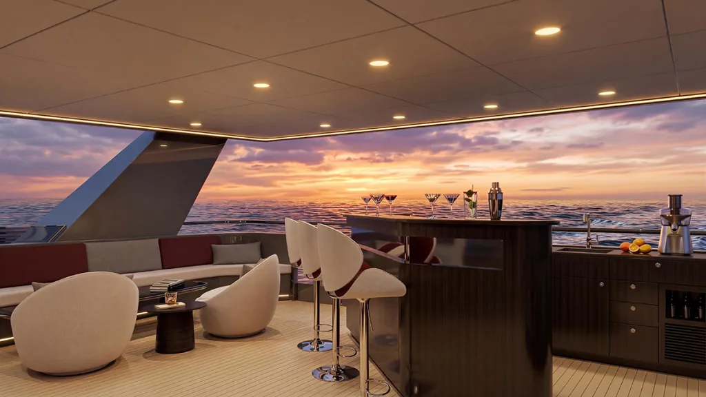 That carries across to the exterior, where aggressive styling has been eschewed in favour of long, horizontal lines and subtle curves. Expansive glazing replaces the traditional windows, inviting natural light in and providing ocean views out. The aft is defined by a sprawling beach club with a pool, two fold-down terraces, and a swim platform. Other exterior highlights include a plush bow lounge and a breezy sundeck bar.