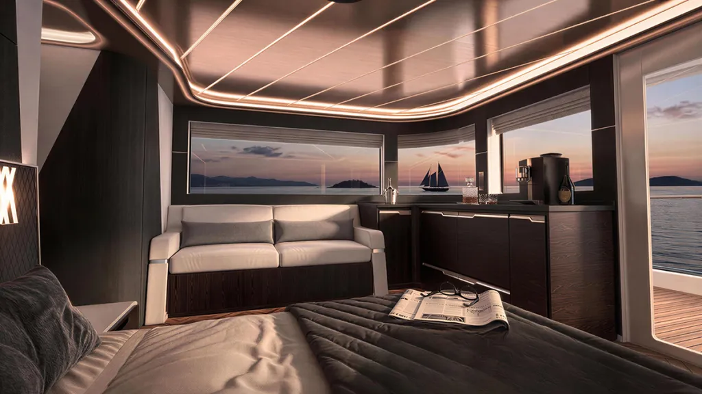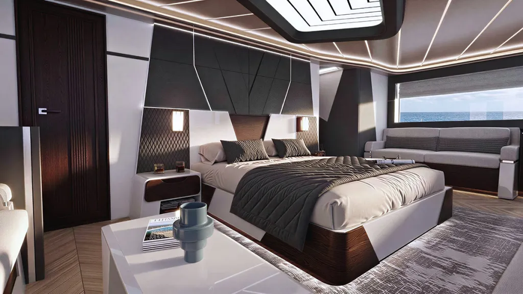 Those on board will enjoy roughly 170 square metres of interior space and over 300 square metres of exterior space, with the open-plan design creating a seamless connection between the two. The layout includes cabins for 11 guests and four crew plus ample lounge and dining space, making the vessel fit for private use or charter.