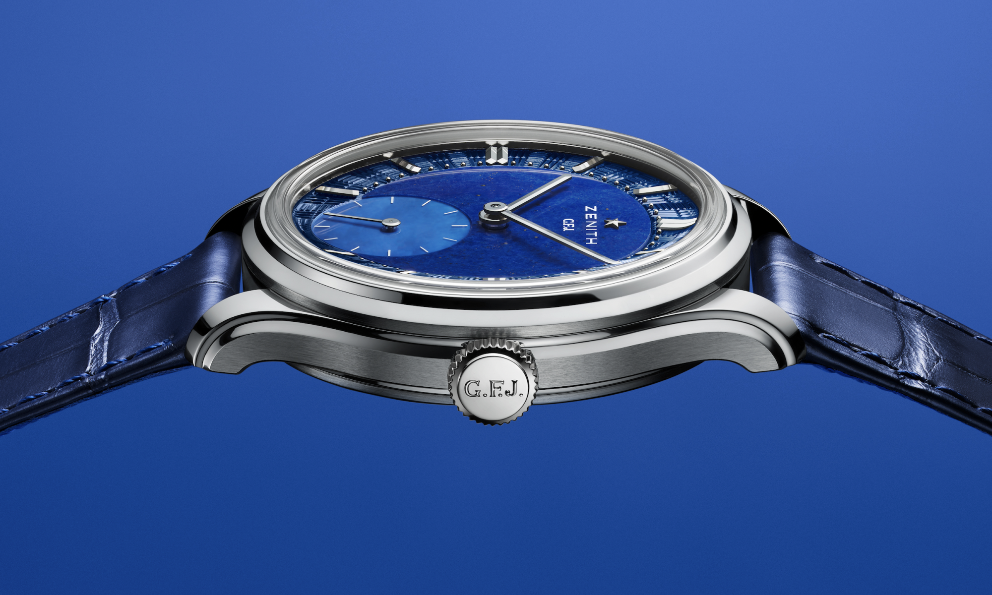 For this reincarnation of the Calibre 135, Zenith has wisely chosen an aesthetic that sets it apart from chronometer watches of yore. Named after the initials of Zenith’s founder Georges Favre-Jacot, this design language consists of a 39 mm platinum case, encircled around a blue dial that is itself made up of three ornate segments—lapis lazuli, mother of pearl and brick-motif guilloché. Limited worldwide to 160 pieces.