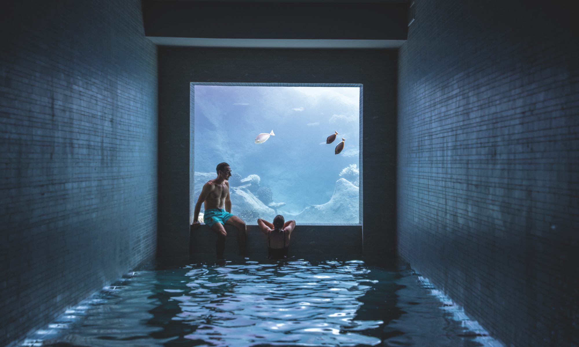 The property, designed and decorated by Ora Architecte and Patrick Raffeneau Design, sits on a lagoon, as if moored, with a stepped infinity pool reaching out to the island’s lagoon. A private swimming hole allows for snorkelling (skinny-dipping optional). But the most jaw-dropping feature is half-hidden. When you arrive, it seems there are two square ponds, teeming with fish, one on either side of the entrance. It’s only after descending to the basement that you realise the “ponds” are actually glimpses into a massive aquarium that runs the entire span of the structure’s lower level, flooding the rooms with blue-tinged light, and connects directly to the lagoon to allow smaller fish to come and go as they please.