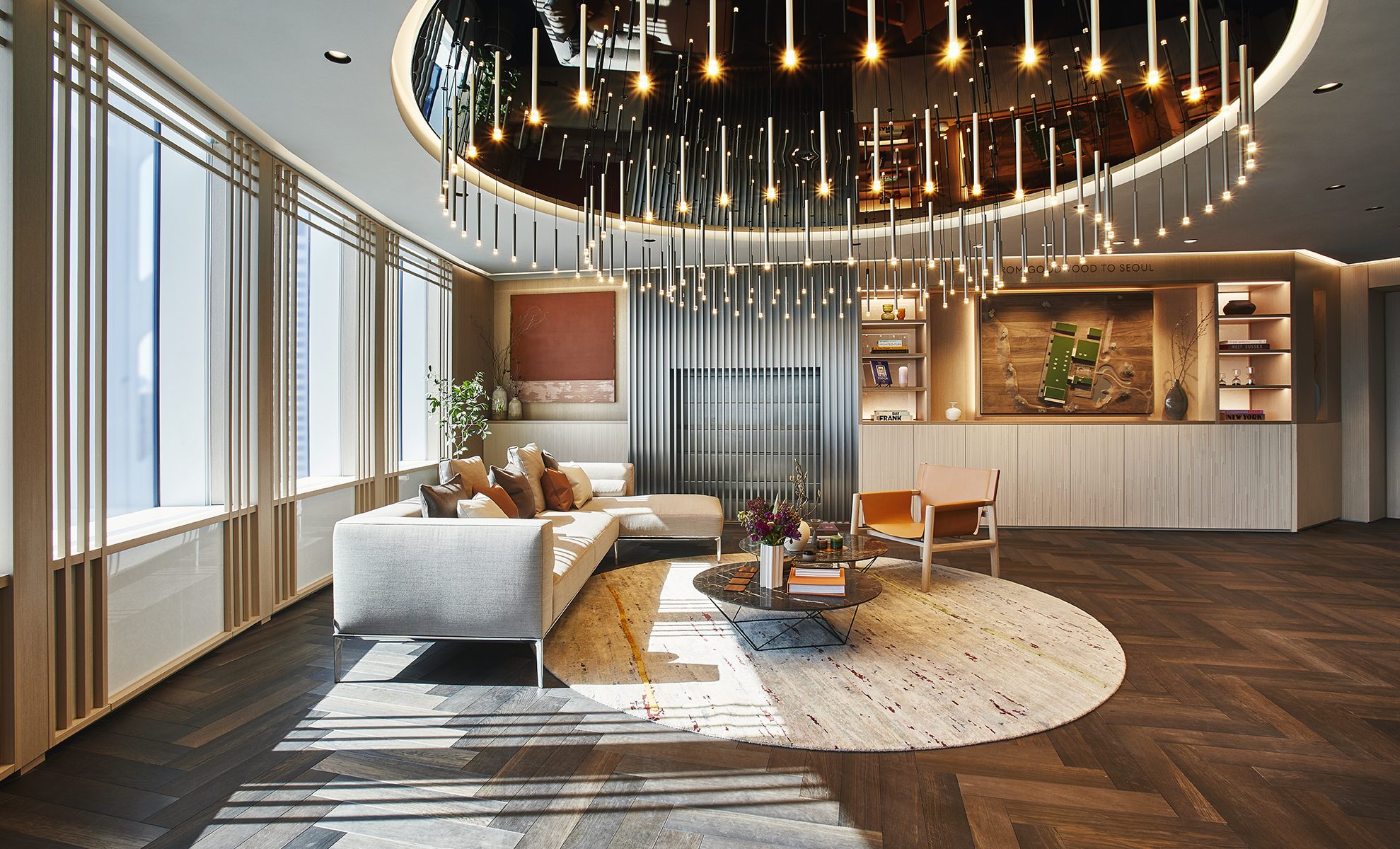 The space is sophisticated yet warm and inviting, infused with motifs from Korea’s rich culture, including elements from traditional hanok house architecture expressed through geometric changho frames and hanji paper tastefully blended into the modern aesthetic.