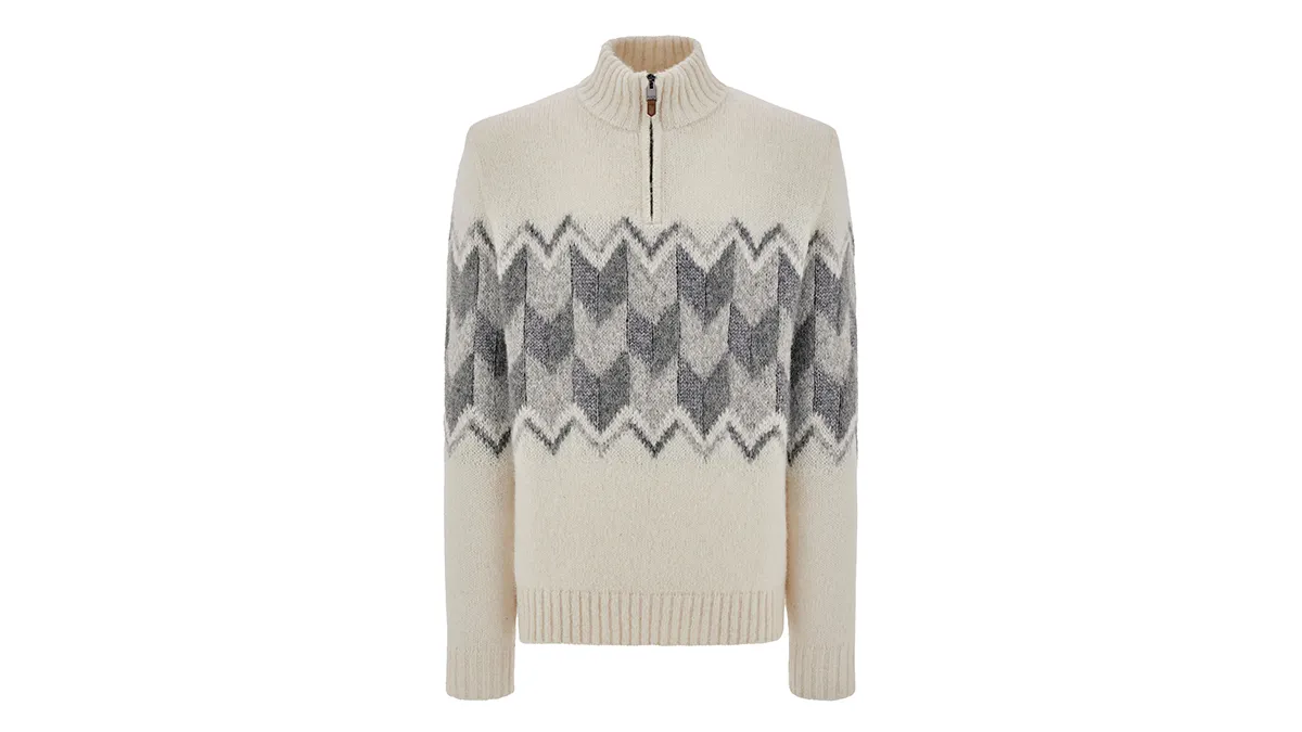 For a hint of graphic distinction, Canali added its freccia—or arrow—motif to this supremely cozy quarter-zip sweater, made from a spongy weave of alpaca, wool, and cotton. The grey-jacquard pattern will put you one step ahead of the guys who didn’t bother to change before those well-earned end-of-day drinks. Mock-neck sweater, approximately $1,650