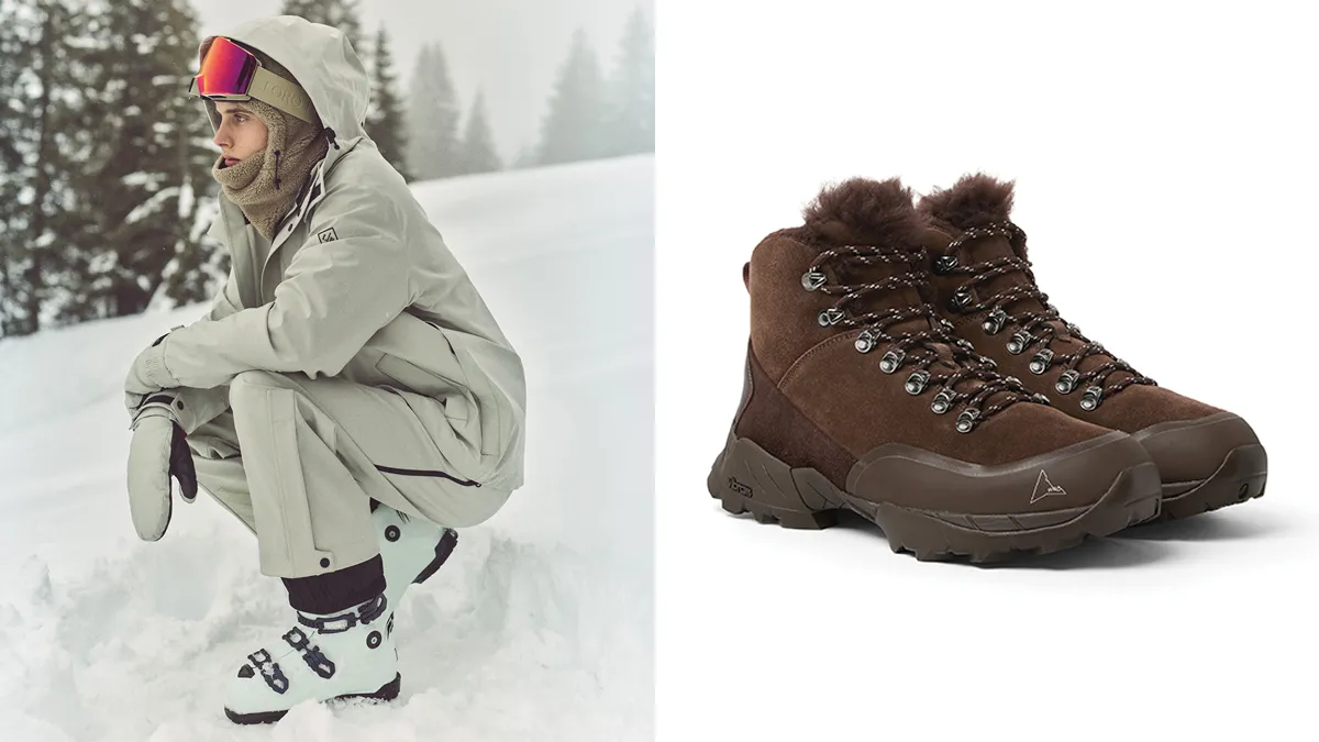 While some ski-focused brands default to nylon, Loro Piana’s ski jacket and salopettes are made from wool, silk, and microfiber and covered in a lightweight layer of graphene that captures body heat. Its suede hikers extend that logic with a plush shearling lining. Above, left to right: Defender ski jacket, $10,150, Bia salopettes, $9,855, and Andreas boots, $3,065 (approximately)